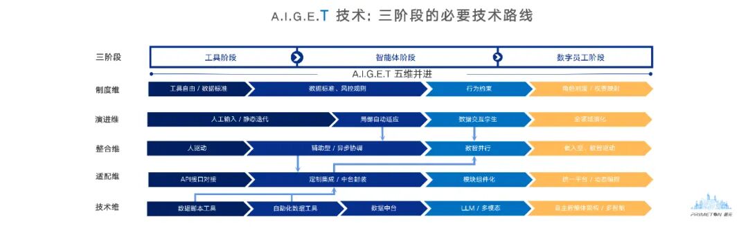 搭建从工具、智能体到数字员工三阶段发展的必要技术路线,强化多模态输出、全领域演化等破解技术黑盒,以架构整合、系统互通等支撑A.I.G.E.T五维并进。