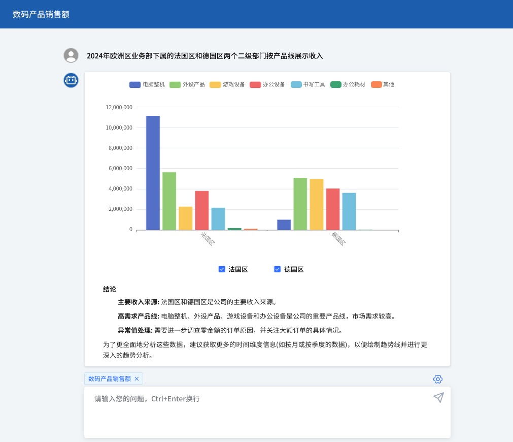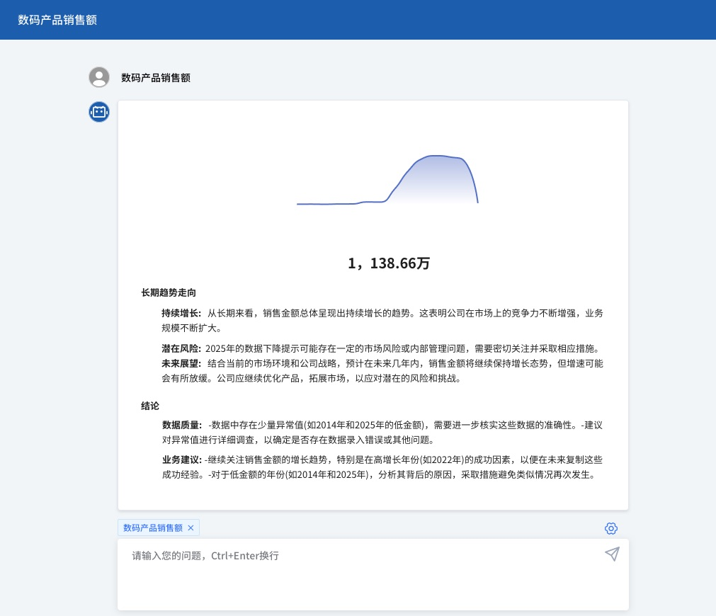 指标检索场景的价值在于降低数据获取的门槛,实现数据普惠与即时洞察。通过自然语言交互,业务用户能够减少对专业IT人员的依赖,如同与一位数据专家对话般,快速、准确地获取其关注的核心业务指标。例如,简单一句“上月数码产品销售额”或“客户流失率变化”,系统便能基于先前数据治理所构建的语义化数据层与指标知识图谱,较快响应并提供准确数据。更进一步,系统还能智能推理并补充上下文信息,如同比、环比、达成率等,这不仅提升了数据消费的效率,更支持决策者在第一时间掌握真实、全面的业务动态,为敏捷决策奠定基础。