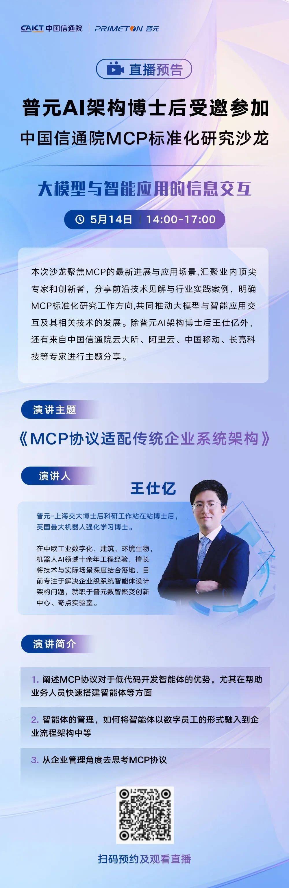 中国信通院MCP标准化研究沙龙将汇聚业内专家和创新者,于线上分享新兴开放标准MCP(Model Context Protocol,模型上下文协议)领域的前沿技术见解与行业实践案例。普元信息与中国信通院云大所、阿里云、中国移动等业界有影响力机构的专家,共同亮相沙龙。 ↓↓↓扫描下方图片中的二维码,预约直播! ——5月14日一起享受前沿见解——