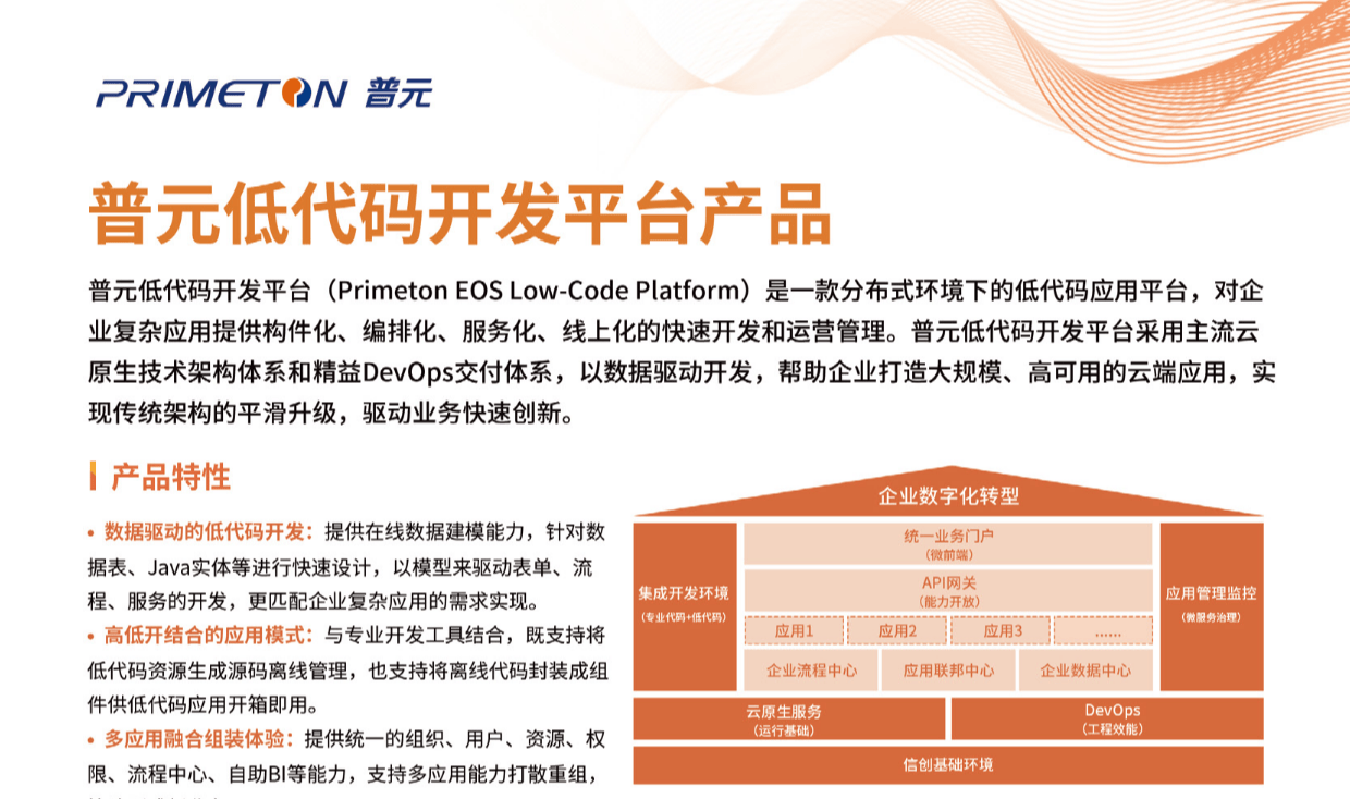 普元低代码开发平台(PrimetonEOSLow-CodePlatform)是一款分布式环境下的低代码应用平台,对企业复杂应用提供构件化、编排化、服务化、线上化的快速开发和运营管理。普元低代码开发平台采用主流云原生技术架构体系和精益DevOps交付体系,以数据驱动开发,帮助企业打造大规模、高可用的云端应用,实现传统架构的平滑升级,驱动业务快速创新。