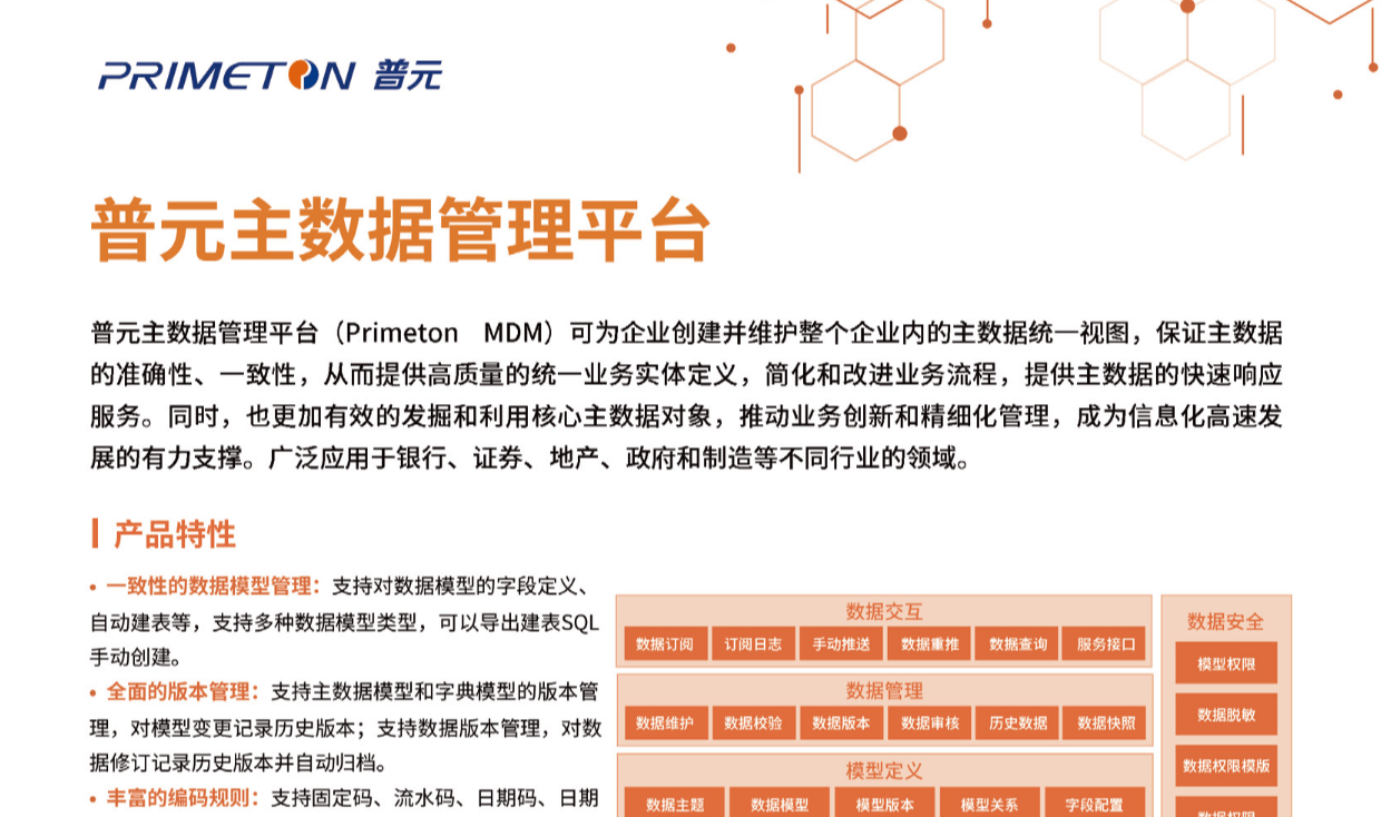 普元主数据管理平台(PrimetonMDM)可为企业创建并维护整个企业内的主数据统一视图,保证主数据的准确性、一致性,从而提供高质量的统一业务实体定义,简化和改进业务流程,提供主数据的快速响应服务。同时,也更加有效的发掘和利用核心主数据对象,推动业务创新和精细化管理,成为信息化高速发展的有力支撑。广泛应用于银行、证券、地产、政府和制造等不同行业的领域。