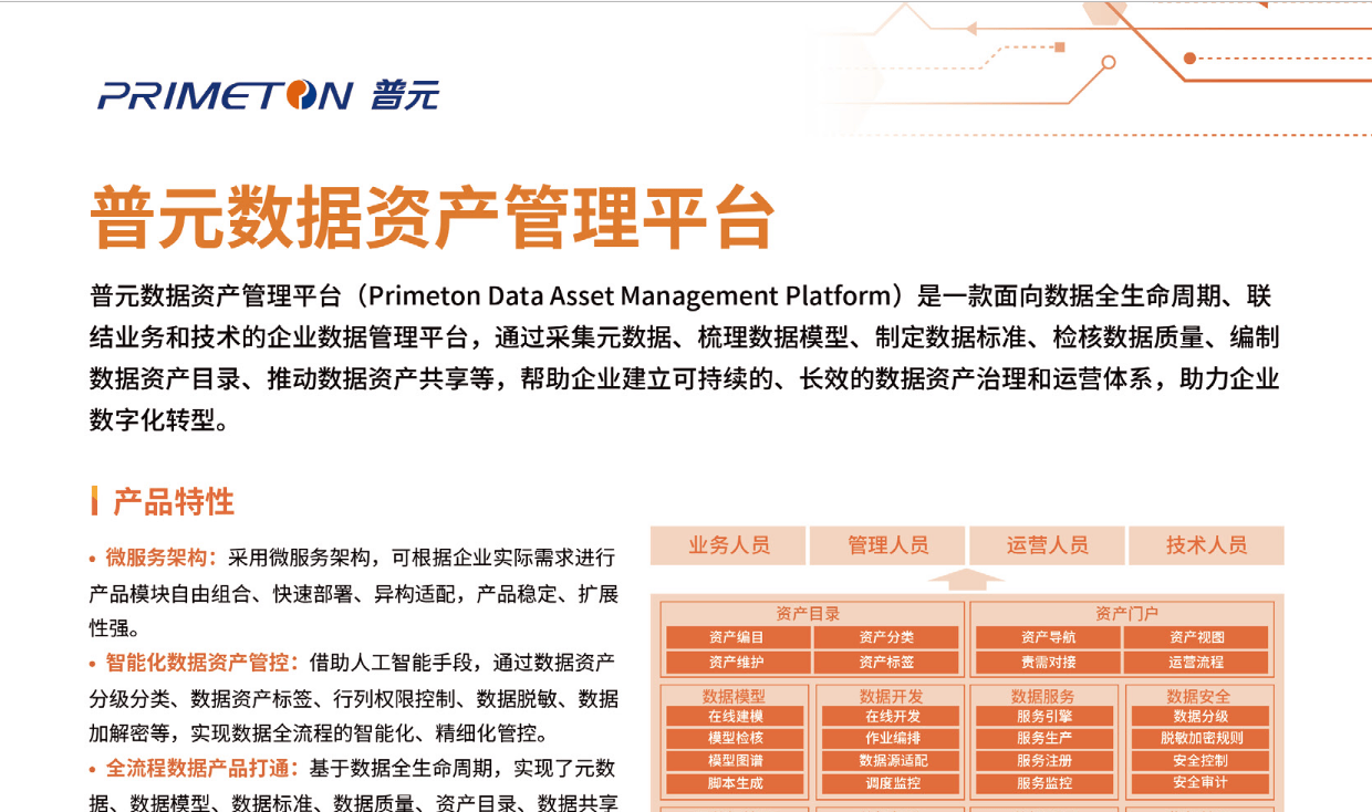 普元数据资产管理平台(PrimetonDataAssetManagementPlatform)是一款面向数据全生命周期、联结业务和技术的企业数据管理平台,通过采集元数据、梳理数据模型、制定数据标准、检核数据质量、编制数据资产目录、推动数据资产共享等,帮助企业建立可持续的、长效的数据资产治理和运营体系,助力企业数字化转型。