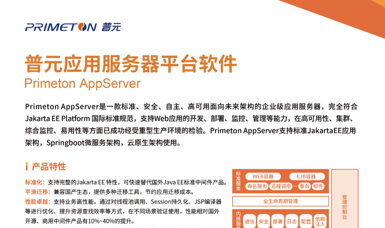 PrimetonAppServer是一款标准、安全、自主、高可用面向未来架构的企业级应用服务器,完全符JakartaEEPlatform国际标准规范,支持Web应用的开发、部署、监控、管理等能力,在高可用性、集群、综合监控、易用性等方面已成功经受重型生产环境的检验。PrimetonAppServer支持标准JakartaEE应用架构,Springboot微服务架构,云原生架构使用。